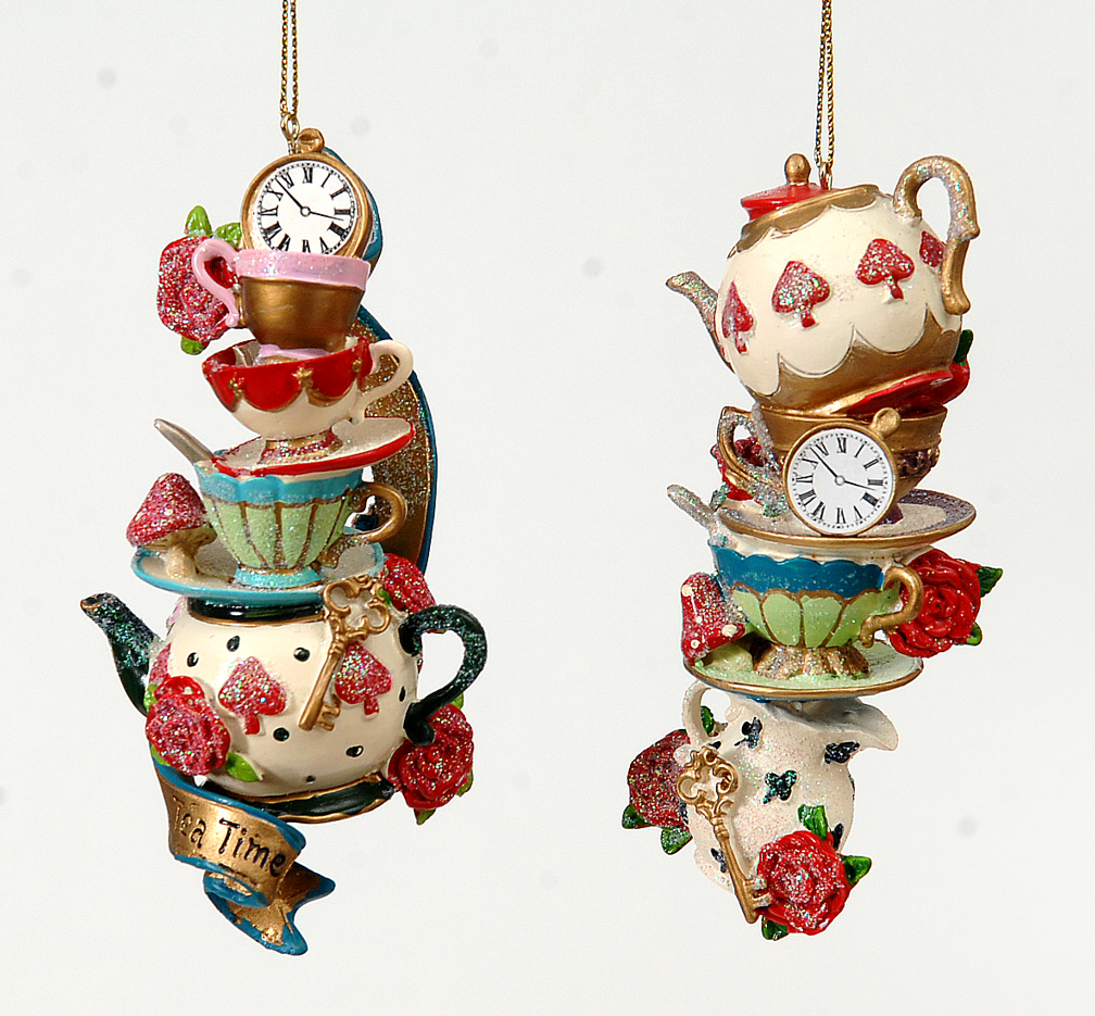 ნაძვის ხის დეკორატიული სათამაშო - ჩაიდანი და ფინჯნები. ბრენდი ევროპული. მასალა: პოლირეზინი. ზომა: 12 სმ.