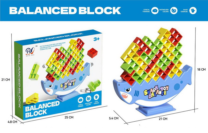 ასაწყობი ბლოკები ზვიგენის ფორმის ბალანსზე. ასაკი: 3 წლიდან. ავითარებს ყურადღებასა და მოთმინებას. ზომა: 5.4x21x18